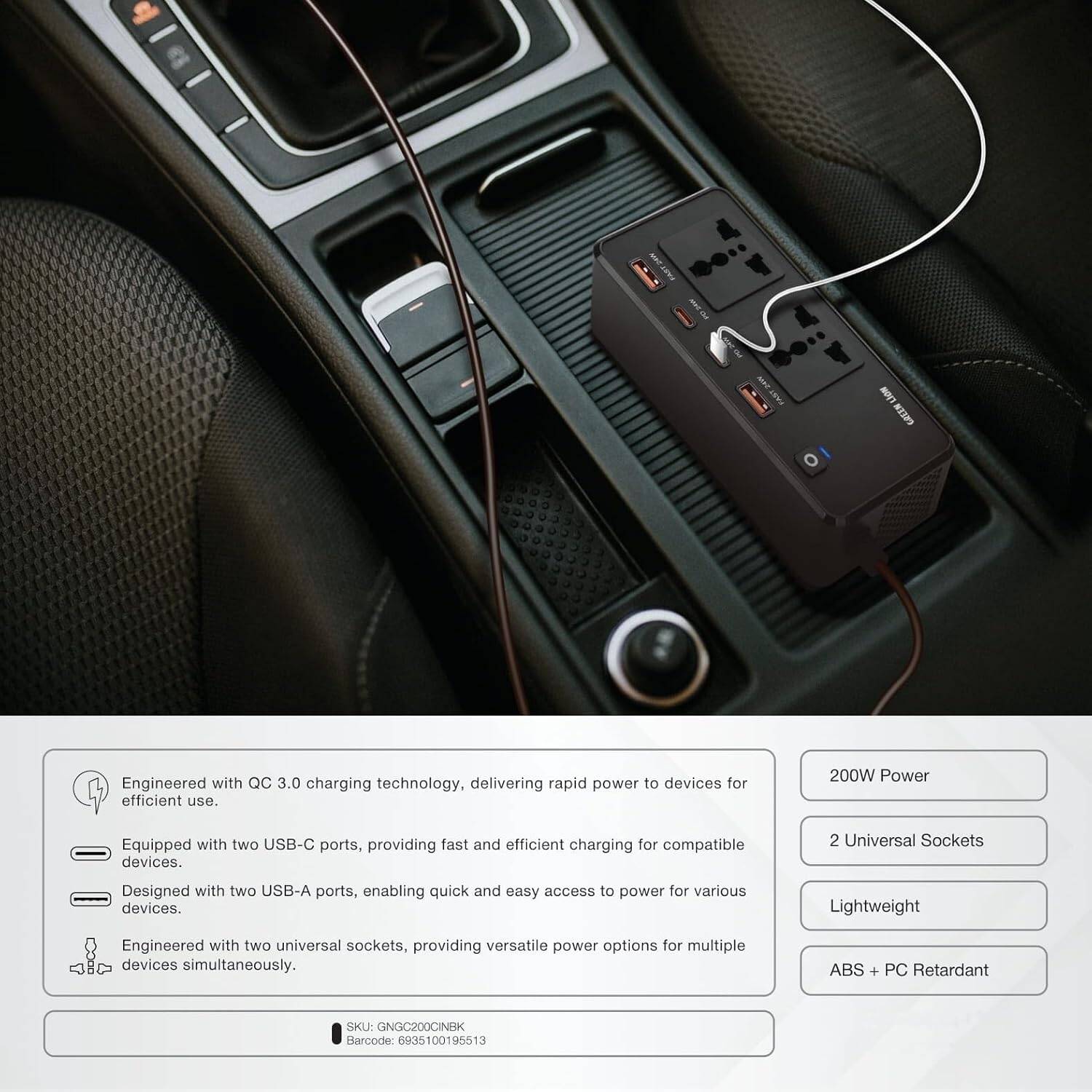 محول طاقة للسيارة Green Lion GC-200، مقبسان عالميان، منفذا USB-A، منفذا USB-C، شحن QC 3.0، طاقة 200 واط، شحن PD 24 واط، مادة متينة مقاومة للهب، صغير الحجم ومناسب - أسود